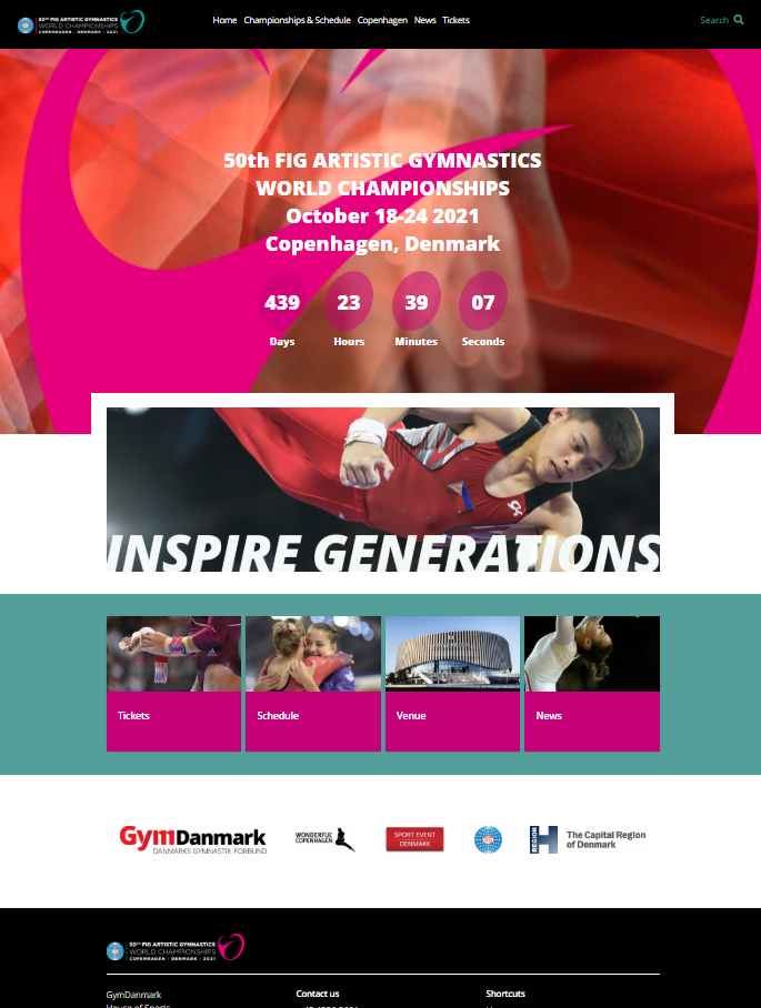 Banners, posters, official documents, social media posts and website design for the World Championships in Artistic Gymnastics 2021 and the European Championships in Team Gym in Ballerup Super Arena 2020